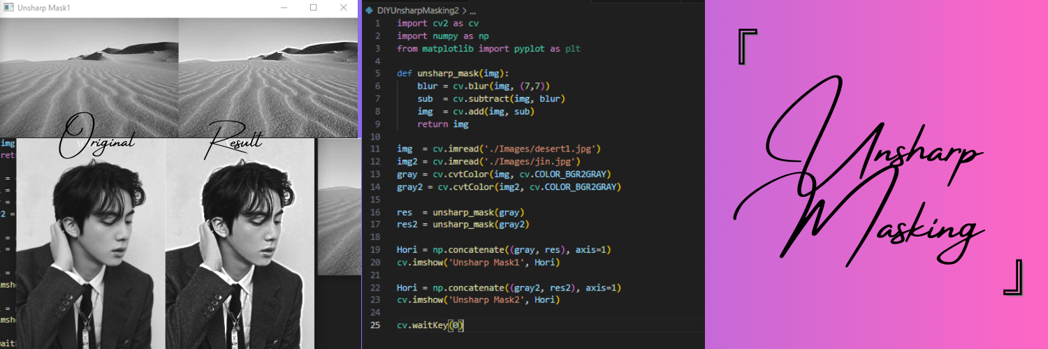 ✨Unsharp Masking by performing blurring, subtraction, and addition, to sharpen an image.